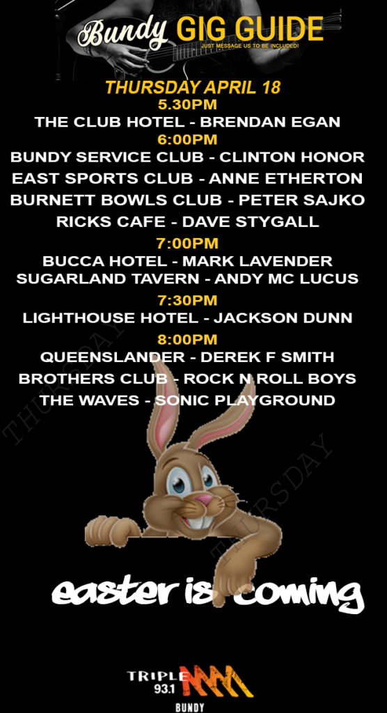 Don’t forget the Bundy Gig Guide’s Facebook page giving you more live music information for the rest of your weekend.