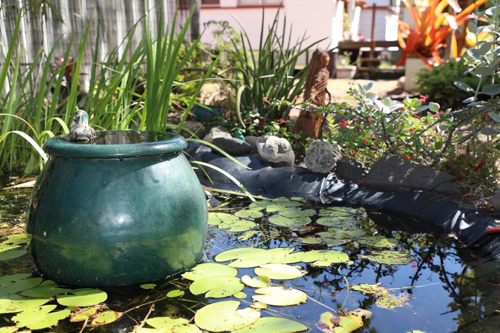 “Water features, including ponds and birdbaths, attract the frogs, parrots, magpies, and swamp birds.