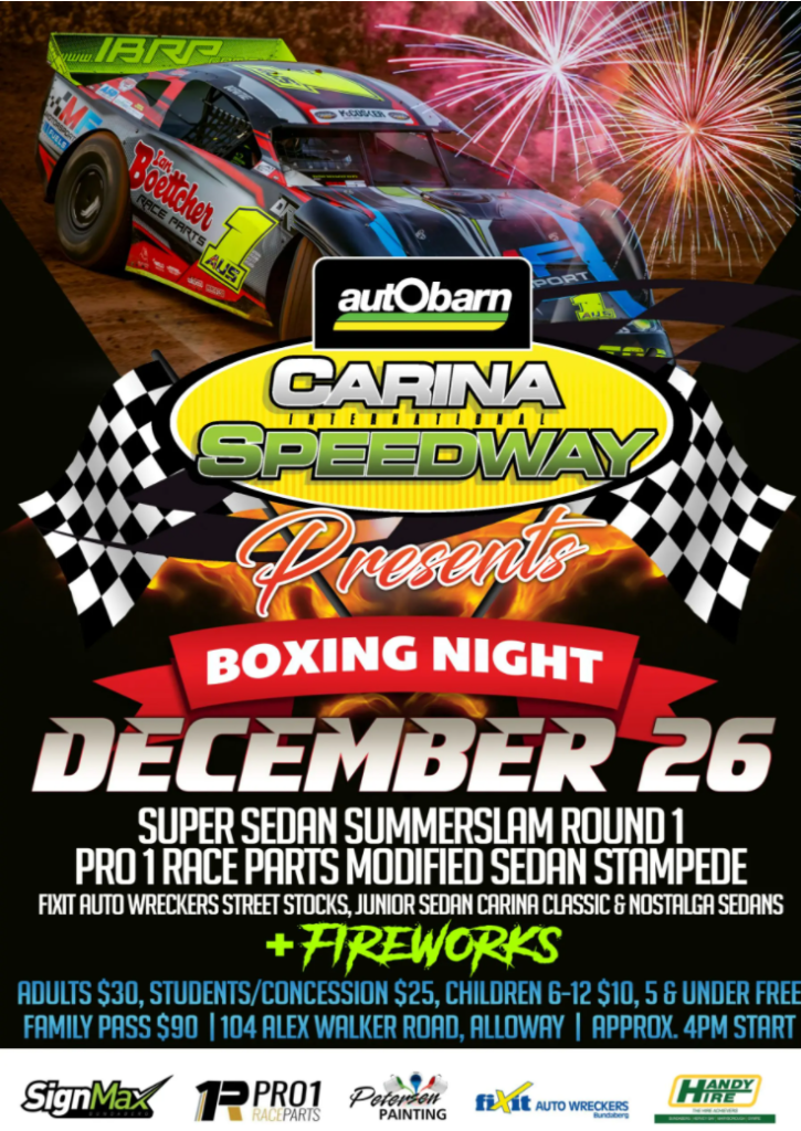 The Pro1 Race Parts Modified Sedan Stampede, proudly supported by PS Designer Homes, has attracted a star studded list of 32 drivers from Queensland, New South Wales, and Victoria at the Boxing Day Spectacular at Autobarn Carina International Speedway this Saturday.