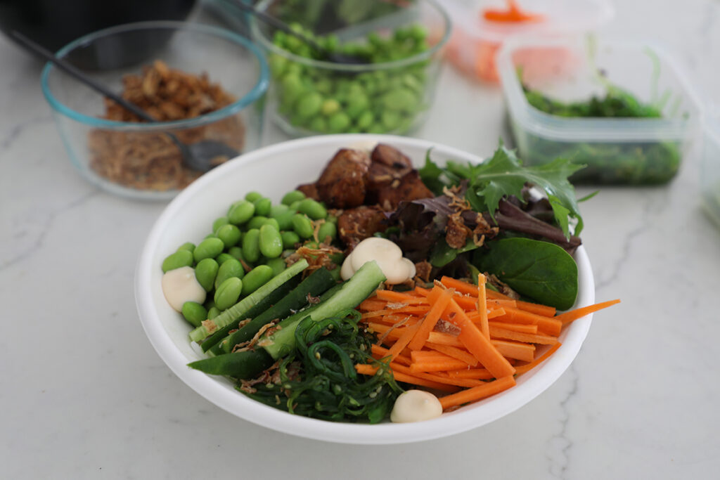 “We offer them a selection of their base – white rice and brown rice, protein – chicken, salmon and tofu, and an assortment of greens our customers can choose from.