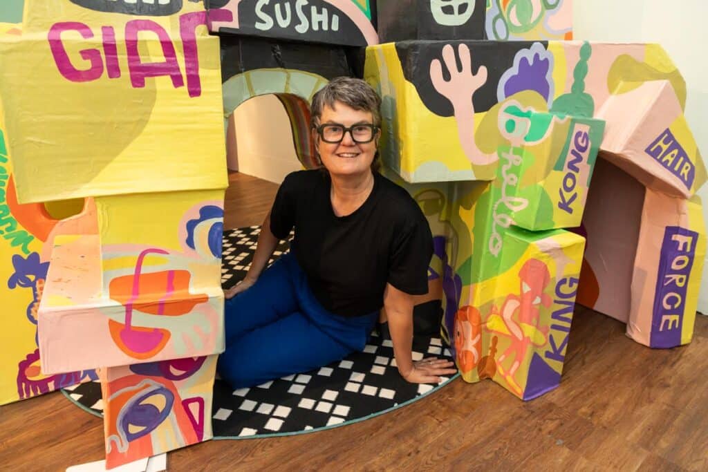 Central to the exhibition is a large colourful construction which references local shops that have inspired Sue, shelves for displaying the visitors’ creations, and passageways for participants to crawl through and explore further.