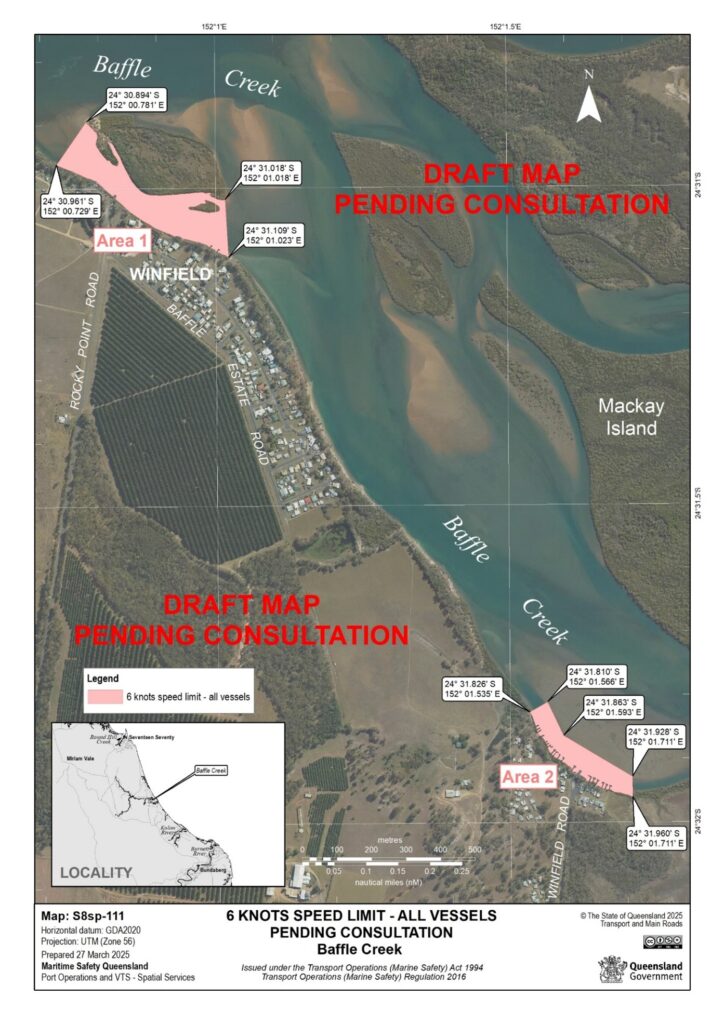 Maritime Safety Queensland (MSQ) is seeking community feedback on a proposal to introduce speed limits for boating in two sections of Baffle Creek.