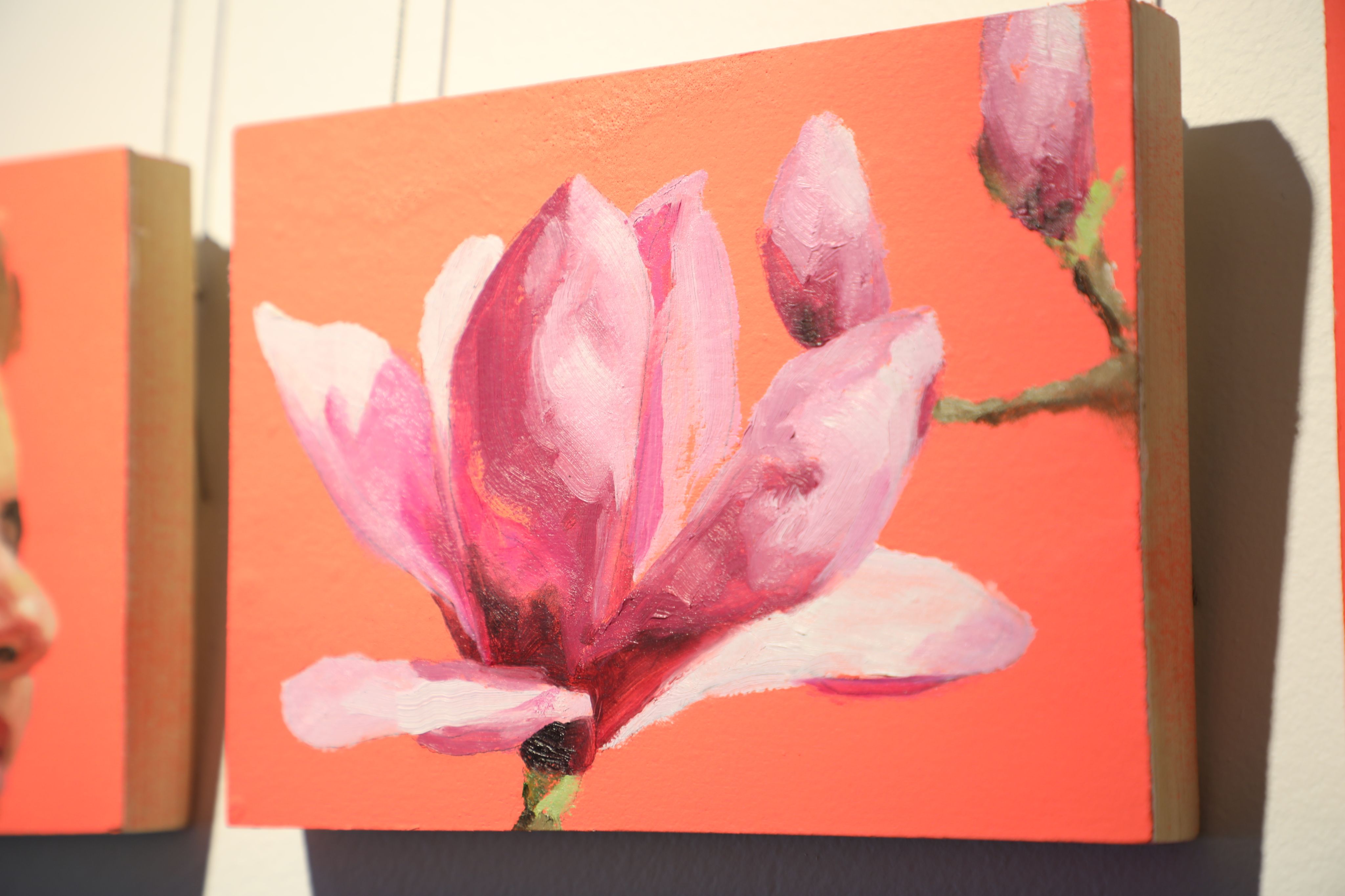 The outer two panels show the peaceful faces of two young women, and the centre panel features a pink magnolia flower.