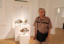 A school of fish made of upcycled metal has found home in the Here + Now exhibition, with John Olsen's art focusing on the...