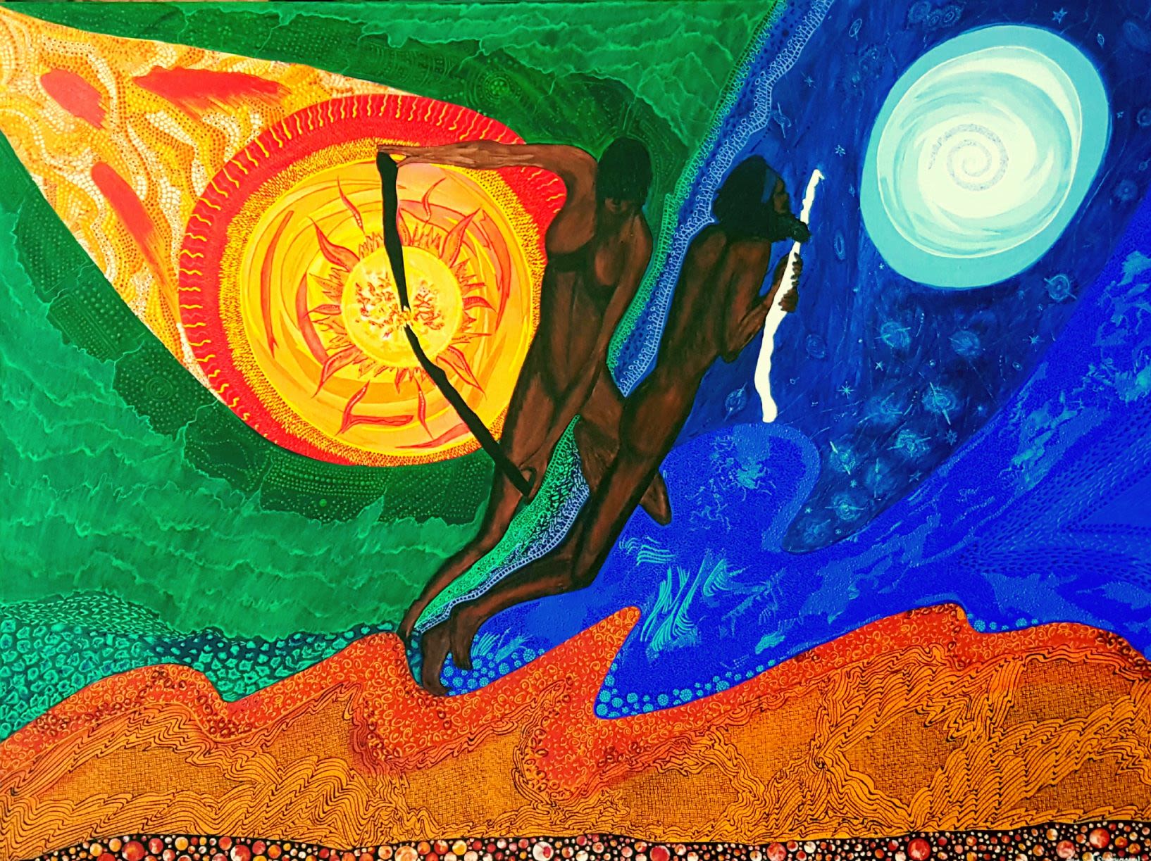 “This work has intricate detail and patterning, and bold colour and design. It depicts a traditional Indigenous story, as well as a universal theme of the interwoven unity of opposites: day and night, summer and winter, yin and yang, male and female,” Veronika said.